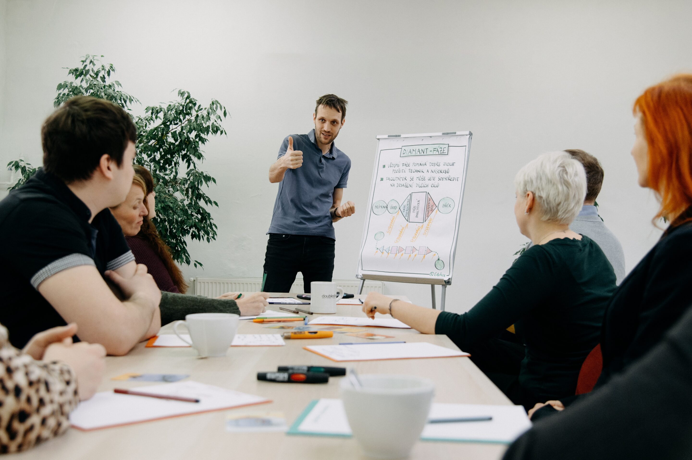 Skupina lidí sedí u jednoho stolu. Diskuse plyne, všichni se zapojují, čas se dodržuje, výstupy dávají smysl. Nejsou slyšet hádky, nikdo není frustrovaný. Zvenčí to může působit, že se setkání „tak nějak povedlo samo“.